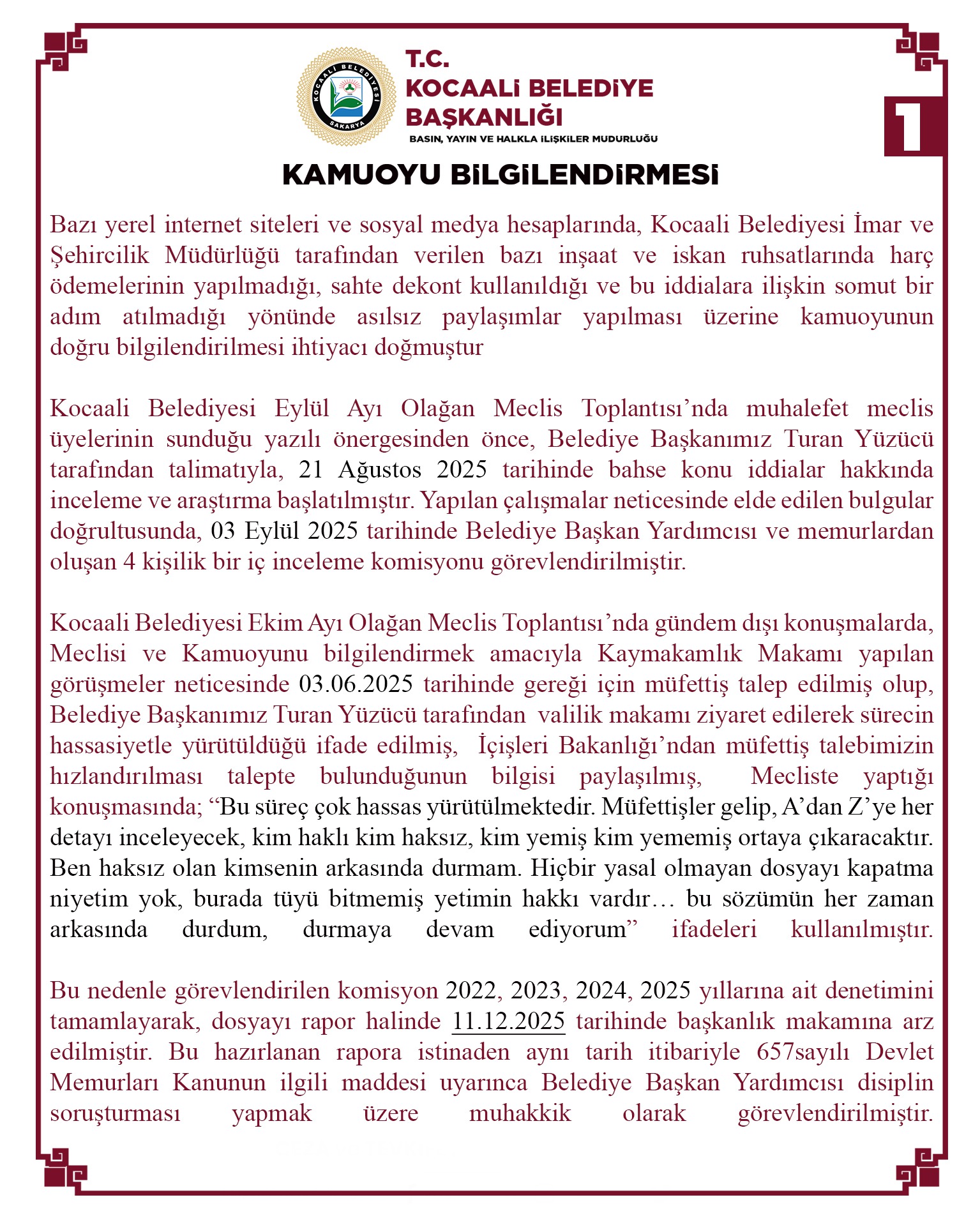 Kocaali Belediyesi Eylül Ayı Olağan Meclis Toplantısı’nda muhalefet meclis üyelerinin sunduğu yazılı önergesinden önce, Belediye Başkanımız Turan Yüzücü tarafından talimatıyla, 21 Ağustos 2025 tarihinde bahse konu iddialar hakkında inceleme ve araştırma başlatılmıştır. Yapılan çalışmalar neticesinde elde edilen bulgular doğrultusunda, 03 Eylül 2025 tarihinde Belediye Başkan Yardımcısı ve memurlardan oluşan 4 kişilik bir iç inceleme komisyonu görevlendirilmiştir.