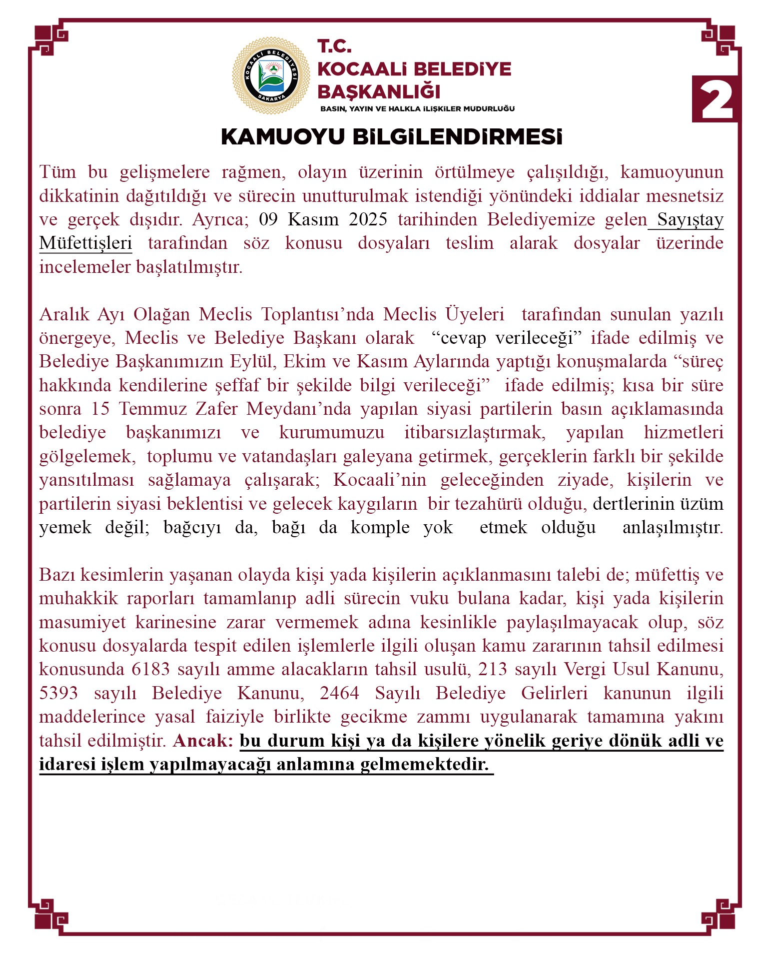 Tüm bu gelişmelere rağmen, olayın üzerinin örtülmeye çalışıldığı, kamuoyunun dikkatinin dağıtıldığı ve sürecin unutturulmak istendiği yönündeki iddialar mesnetsiz ve gerçek dışıdır. Ayrıca; 09 Kasım 2025 tarihinden Belediyemize gelen Sayıştay Müfettişleri tarafından söz konusu dosyaları teslim alarak dosyalar üzerinde incelemeler başlatılmıştır.